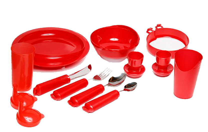 Набор позволяет самостоятельно принимать пищу людям с патологией кистей, слабого связочного аппарата, при постинсультных состояниях. В комплекте: стакан, поильник, приспособление для яиц, тарелки, ограничитель на тарелку, столовая ложка, чайная ложка, вилка, нож.