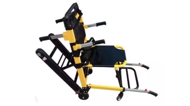 Данный эвакуационный стул имеет небольшие колеса для передвижения по горизонтальной поверхности и компактный гусеничный механизм для «скользящего» передвижения вниз по лестницам.