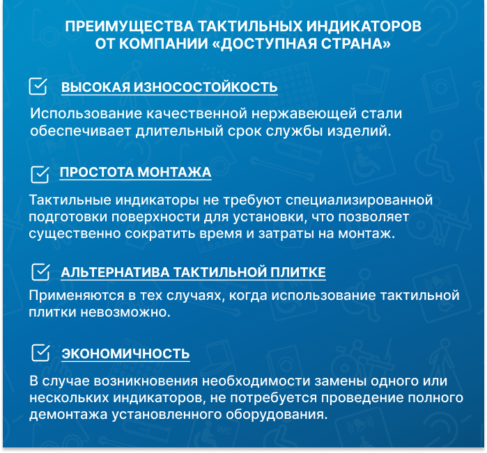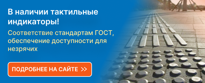 | Тактильные индикаторы предназначены для разметки путей людям с частичной или полной потерей зрения. Они служат для обозначения опасных участков и упрощают ориентирование в пространстве для незрячих.